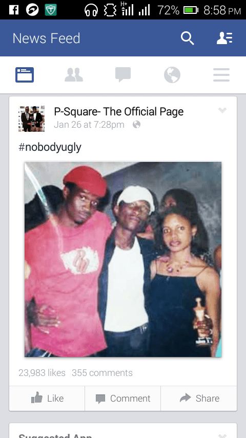 wow!!!!! See This Throwback Picture Of P-Square January 27, 2017 / faveguy They posted the pic. on their Facebook page today with the hash tag “nobodyugly” See a screenshot below Share this amazing post with your friends. Share on X (Opens in new window) X Share on Facebook (Opens in new window) Facebook Share on LinkedIn (Opens in new window) LinkedIn Share on Telegram (Opens in new window) Telegram Share on WhatsApp (Opens in new window) WhatsApp Email a link to a friend (Opens in new window) Email Print (Opens in new window) Print Share on Reddit (Opens in new window) Reddit Share on Tumblr (Opens in new window) Tumblr Share on Pinterest (Opens in new window) Pinterest Like Loading... Related