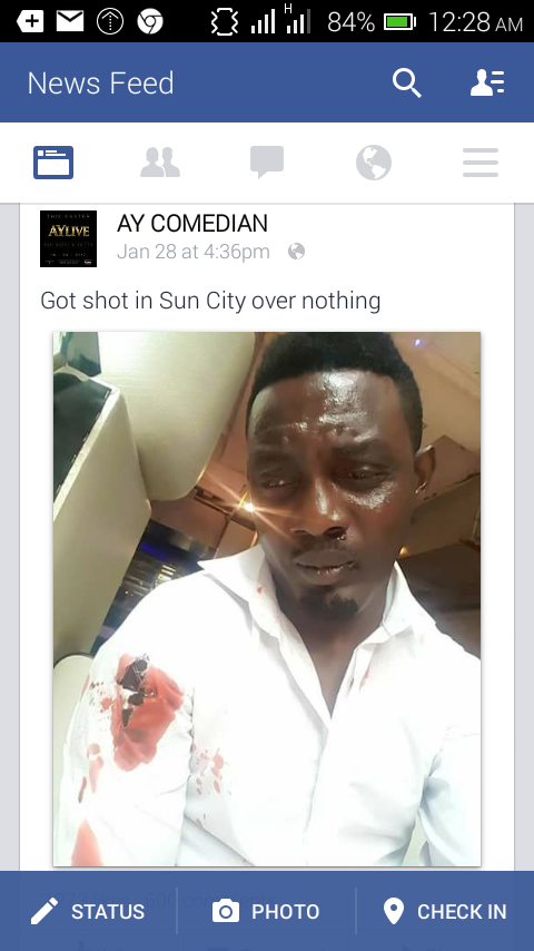 WHAT??? AY Shot? January 28, 2017 / faveguy The Nigerian comedian, AY posted yesterday on his FB page that he was shot at Sun City for nothing. See the screenshot below Share this amazing post with your friends. Share on X (Opens in new window) X Share on Facebook (Opens in new window) Facebook Share on LinkedIn (Opens in new window) LinkedIn Share on Telegram (Opens in new window) Telegram Share on WhatsApp (Opens in new window) WhatsApp Email a link to a friend (Opens in new window) Email Print (Opens in new window) Print Share on Reddit (Opens in new window) Reddit Share on Tumblr (Opens in new window) Tumblr Share on Pinterest (Opens in new window) Pinterest Like Loading... Related