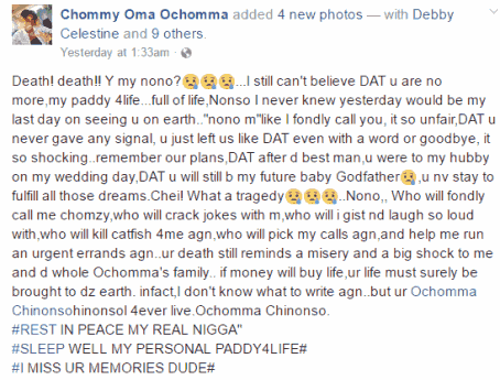 Ochomma who was devastated with the news of Nonso’s death took to FB to mourn him…
