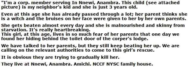 A serving NYSC Corper in Nnewi Anambra state has exposed the parents of a 3 year old girl identified as Sarah for allegedly torturing her because they think she is using witchcraft to ruin their family.